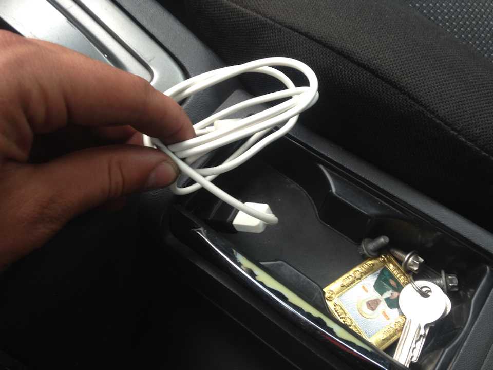В итоге я к нему подсоединил двухжильный провод, один для магнитолы, второй в резерв для питания планшета. Протянул заодно провод USB в кармашек около ручника, и подключил кабель для зарядки и прослушивания музыки с Iphone.
