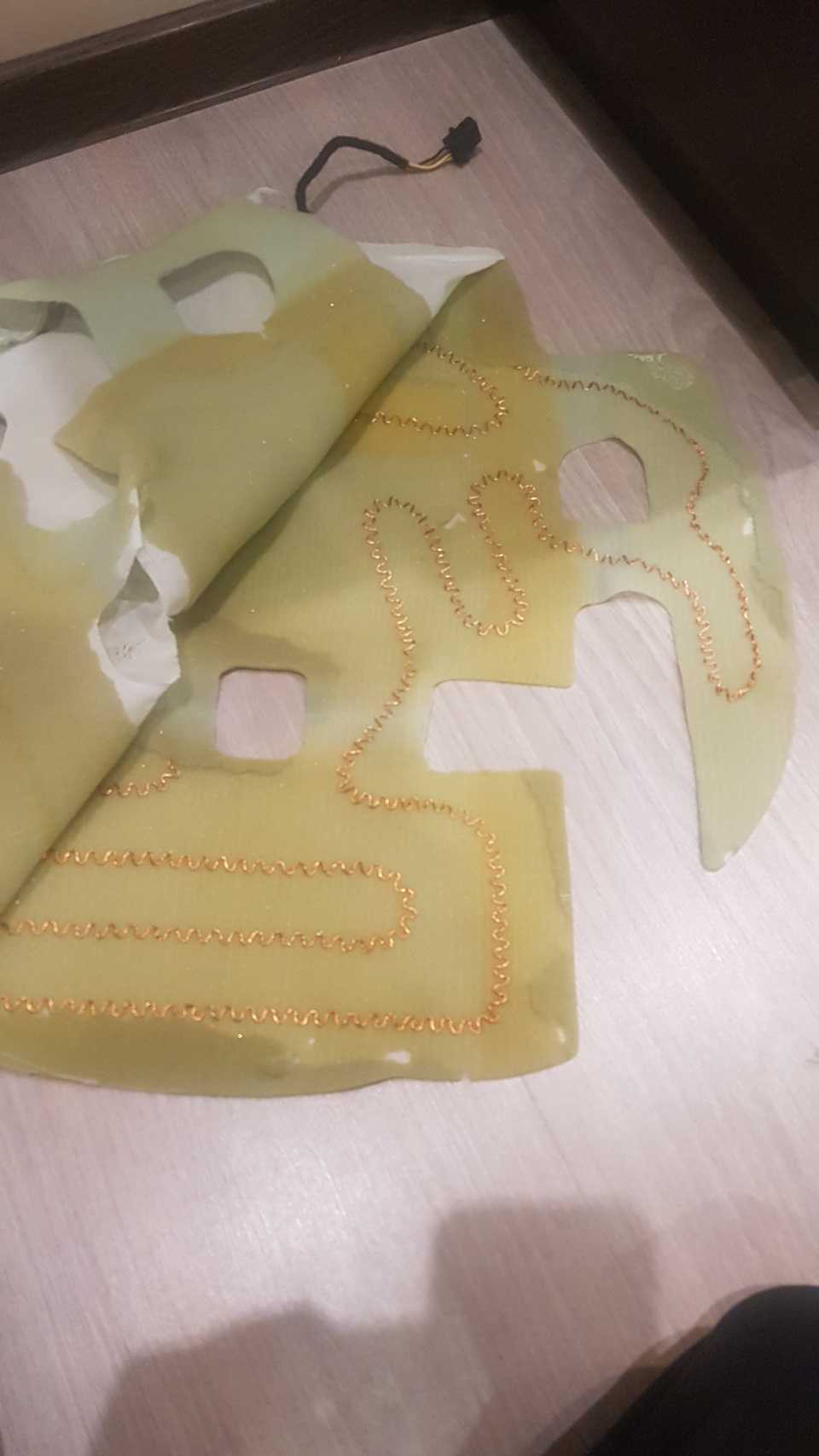 Место обрыва ровно обрезаю с двух сторон, все волосинки провода спаиваю в кучу, пару сантиметров провода с одной стороны протягиваю и соединяю обе пайки в одну. Пайку потом надо затолкать в поролон сиденья. Главное в этом деле толково пропаять все волосинки провода. Белую ткань мата приклеил обратно с помощью аэрозольного клея для ткани.
