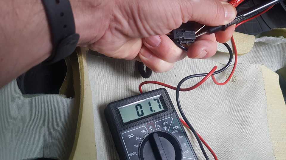 задрал вверх обивку спинки; увидел провод подогрева, взялся за него. и понял, что он переломлен (обе жилки) на расстоянии примерно 1 см от того места, где он (провод) входит в подогрев. отрезал в месте облома; мультиметром замерил сопротивление подогрева — ЕСТЬ! Есть 1 Ом!