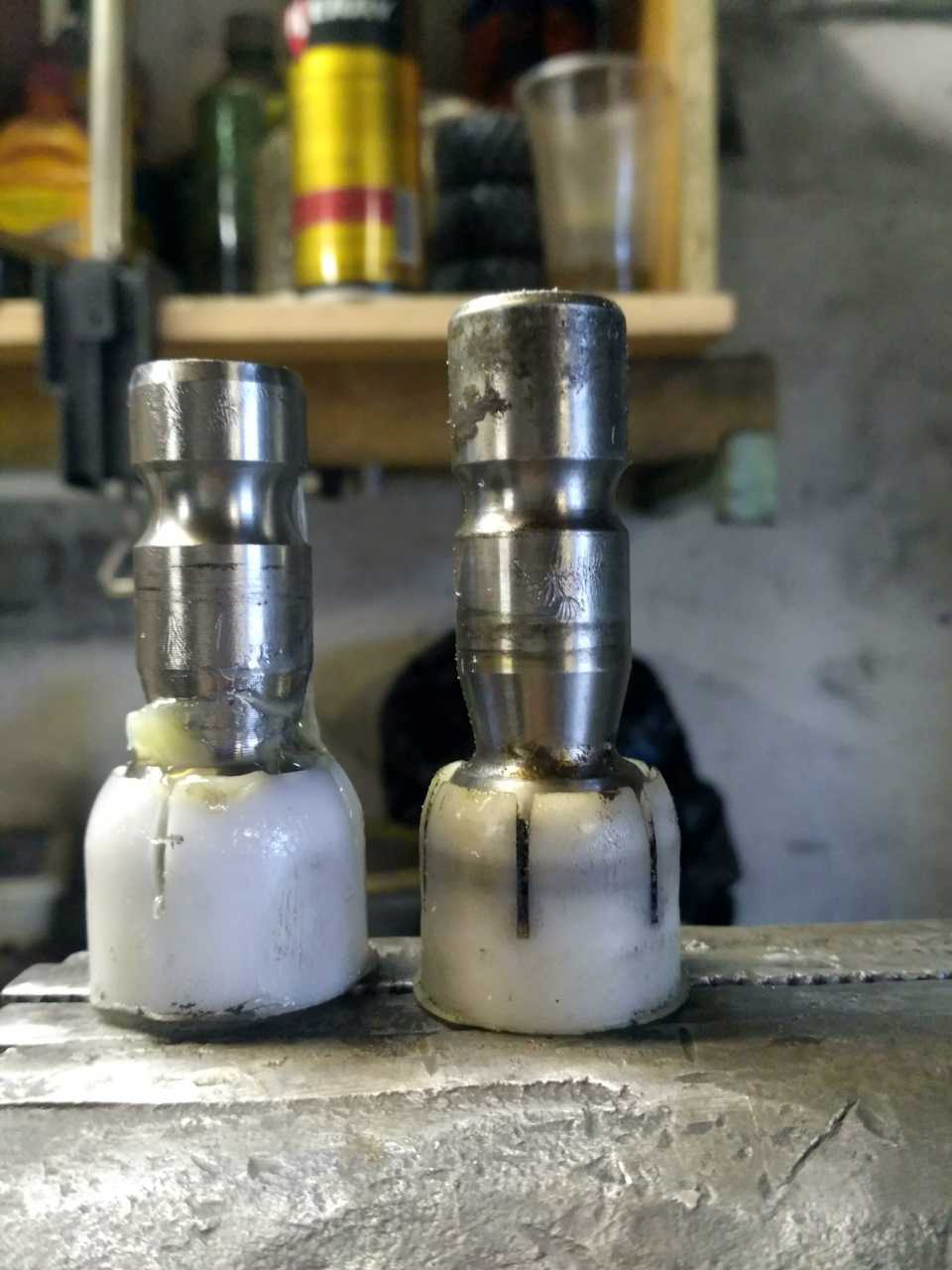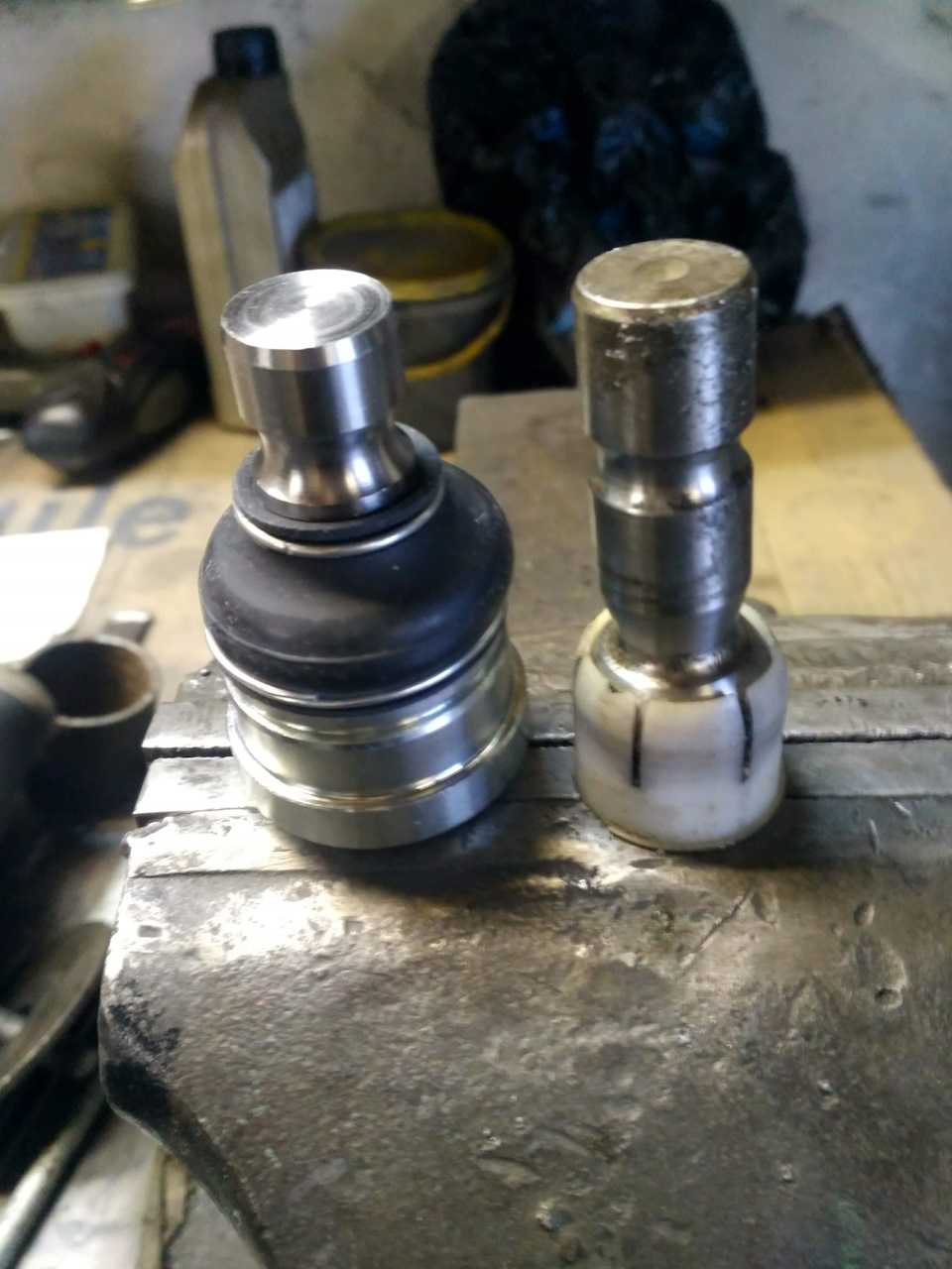 Обтачивал с помощью дрели, болт с гайкой+наждачка и дрель.Убрать где то 2мм.Один рычаг я собрал и вот ну не понравился он мне совсем.Причем когда разобрал вторую шаровую, сухарь был с трещинной((Пипец запчасти делают!И я заказал шаровую от сааб, правда пыльник оставил от доды.