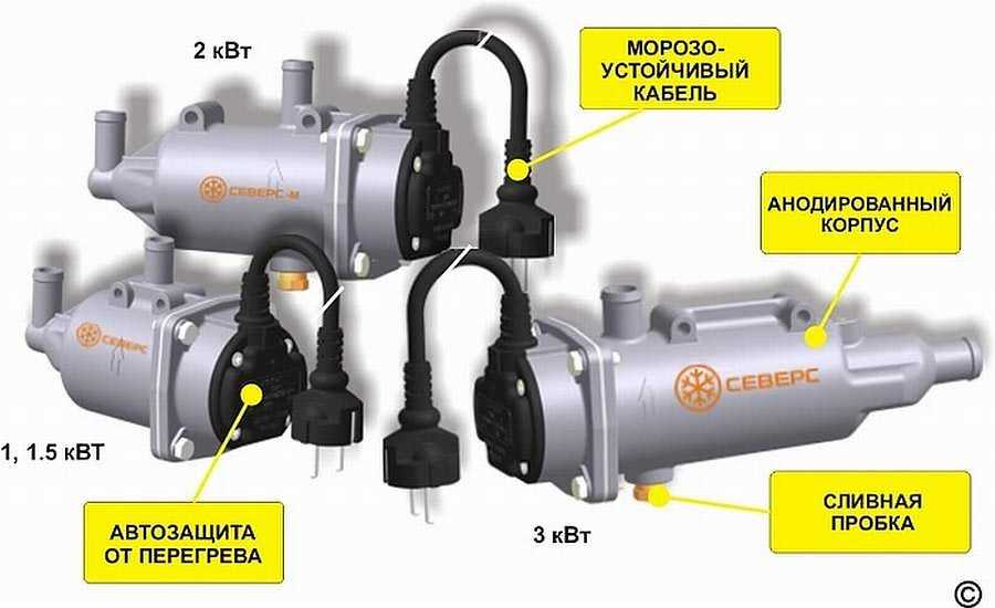 Мощность нагревательных элементов колеблется в диапазоне от 500 Ватт до 4 квт. Набор дополнительных возможностей зависит от модели и комплектности каждого такого устройства. В продаже есть и довольно простые подогреватели, которые вкручиваются в заглушки или сливные пробки охлаждающих систем моторов.