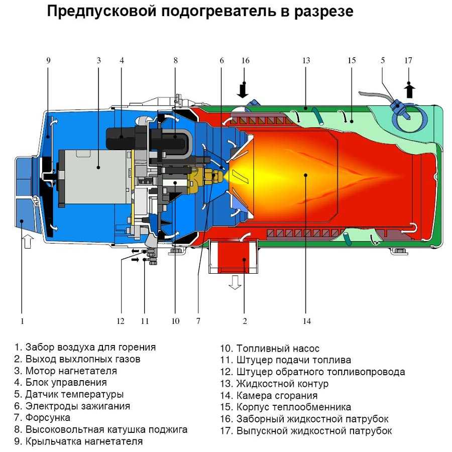 Современный подогреватель устроен довольно просто и мало чем отличается от кипятильника. Принцип его работы состоит в том, чтобы нагреть охлаждающую жидкость (антифриз, тосол) до рабочей температуры, от 60 до 70 °C. Нагреваясь, жидкость начинает перемещаться по патрубкам системы охлаждения, нагревая при этом детали двигателя. Для ускорения теплообмена, многие модели снабжены помпами, создающими давление в малом контуре охлаждающей системы.