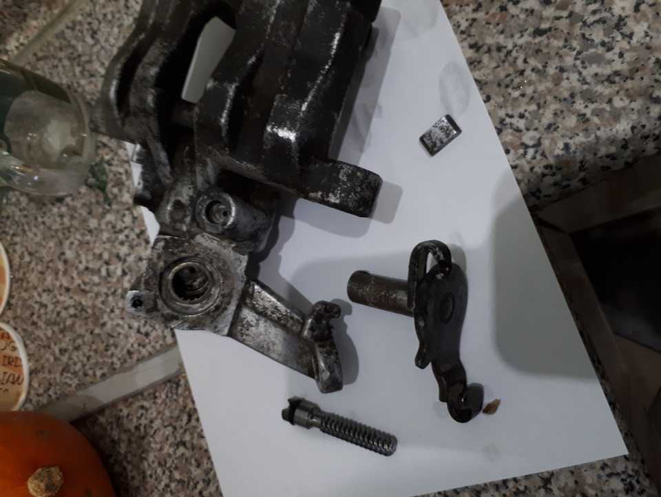 Высверлил у токаря и нарезал резьбу на 5М. Пружинную шайбу коронкой снял набив на нее головку на 22. Пальцами расшатывая достал шток с резьбой, на который накручивается поршень, под ним пинцетом извлек флажек или толкатель этого штока и сам рычаг ручника, к которому был присоединен трос.