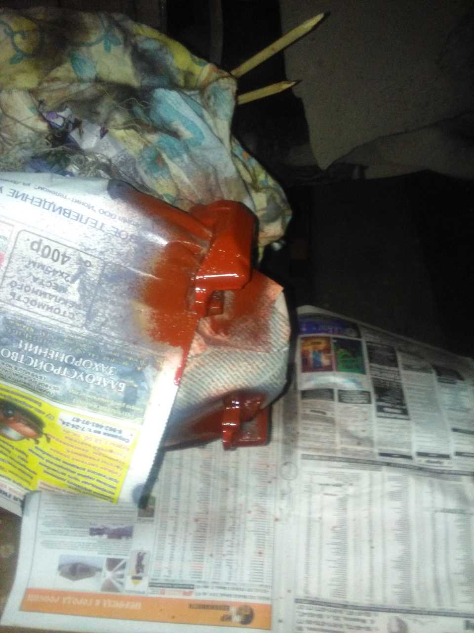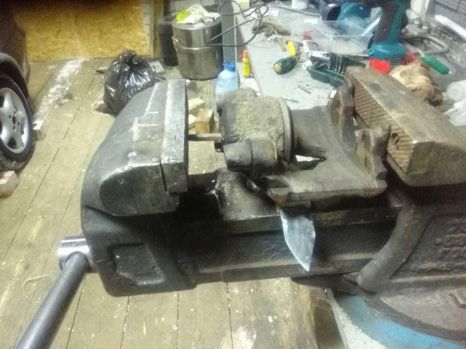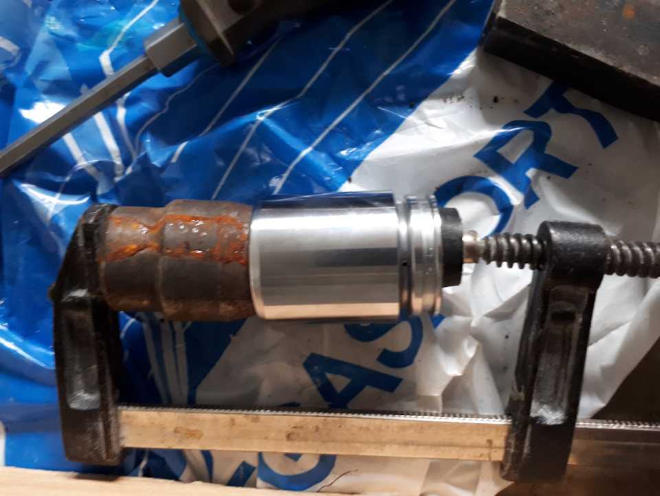 Далее надо вынуть поршень. В нормальном состоянии он выдавливается отверткой через отверстие под болт шланга, но мой там сидит намертво. Я ж его туда загонял сломав две струбцины. Вот сумасшедший-то! )) Короче, слава деду, есть тиски! Приспособив битку в дырку и взгромоздив на тиски, я выдавил поршень.