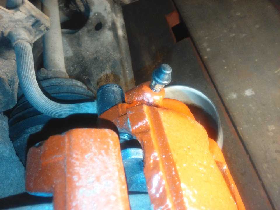 Откручиваем заглушку суппорта шестигранником на 6, но не выкручиваем полностью, т.к. внутри суппорта тормозная жидкость. Кладем суппорт так, чтобы она не вытекала.